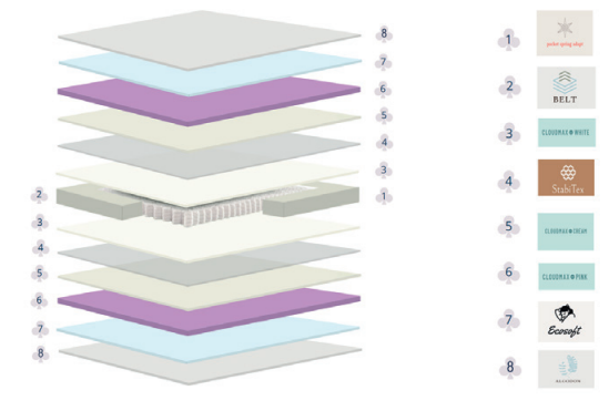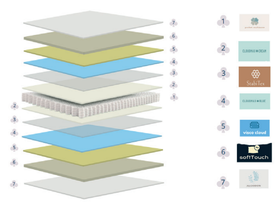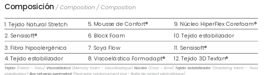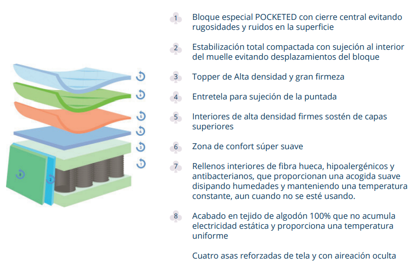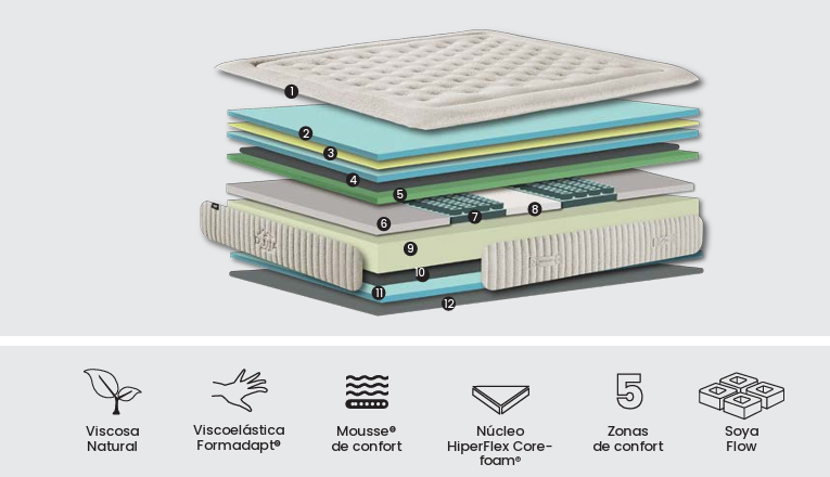 El colchón Zenith Soft ofrece un descanso adaptable y envolvente gracias a su núcleo DualSac® Soft con doble suspensión para una mayor ergonomía y flexibilidad, mientras que el látex, el algodón y el Aquapur® aportan suavidad, transpirabilidad y confort térmico con una correcta alineación de la columna.