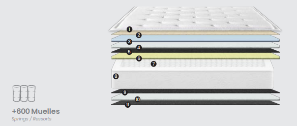- Núcleo de muelles embolsados con 5 zonas de confort que proporciona una adaptación precisa a cada parte del cuerpo y un soporte equilibrado durante el descanso.