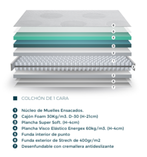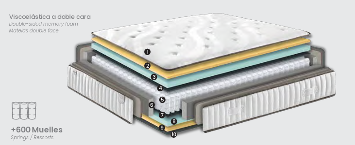- Capas de viscoelástica de diferentes densidades que se adaptan al cuerpo y aportan un confort progresivo