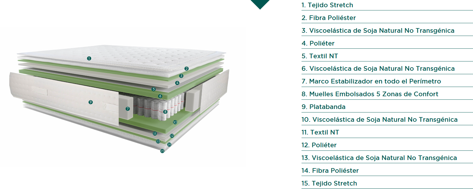 - Acolchado tapa a tapa con viscoelástica de soja natural no transgénica, que incrementa el confort y la sensación envolvente.