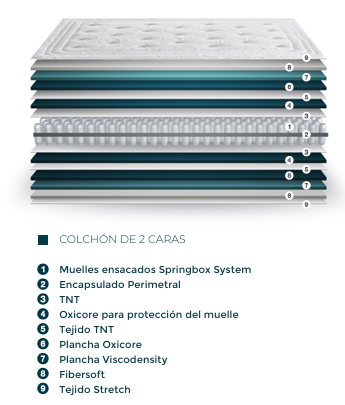 • Incorpora Springbox System, una carcasa de 1200 muelles ensacados con calibre 1,8”, diseñada con diferentes zonas de confort que favorecen un descanso óptimo y equilibrado.